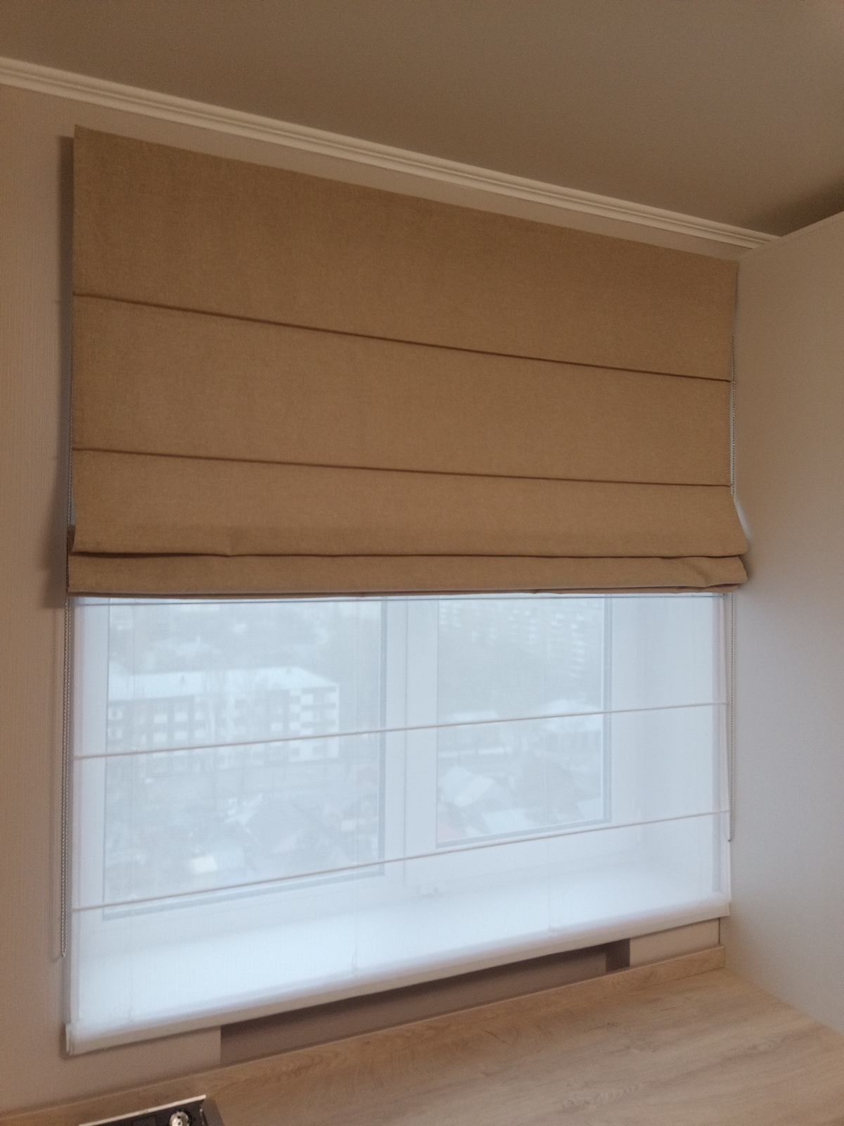Римская штора день-ночь блэкаут однотонный бежевый, карниз верёвочный